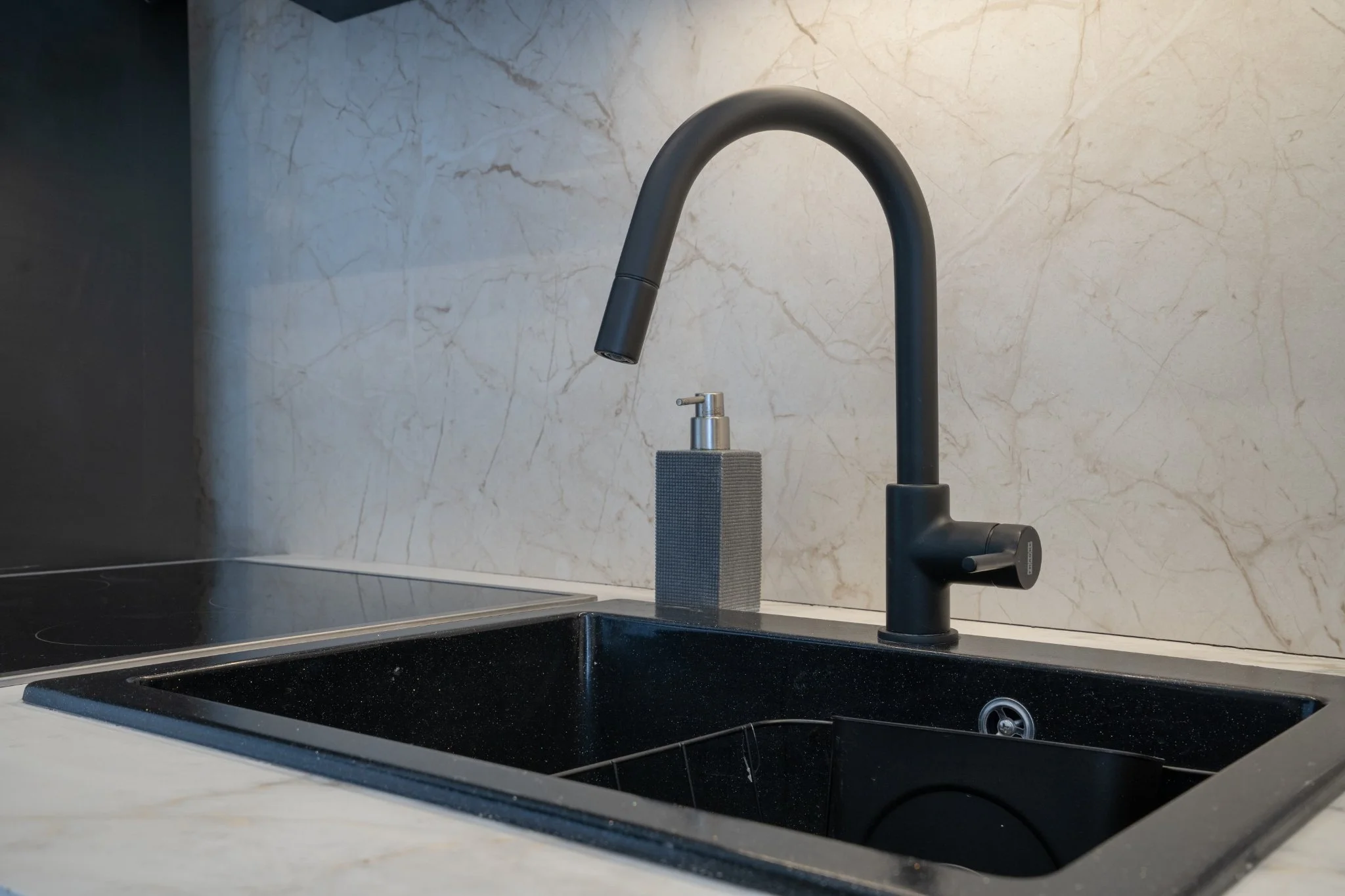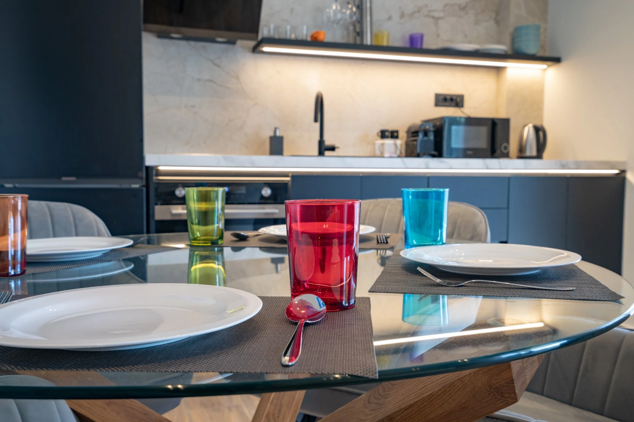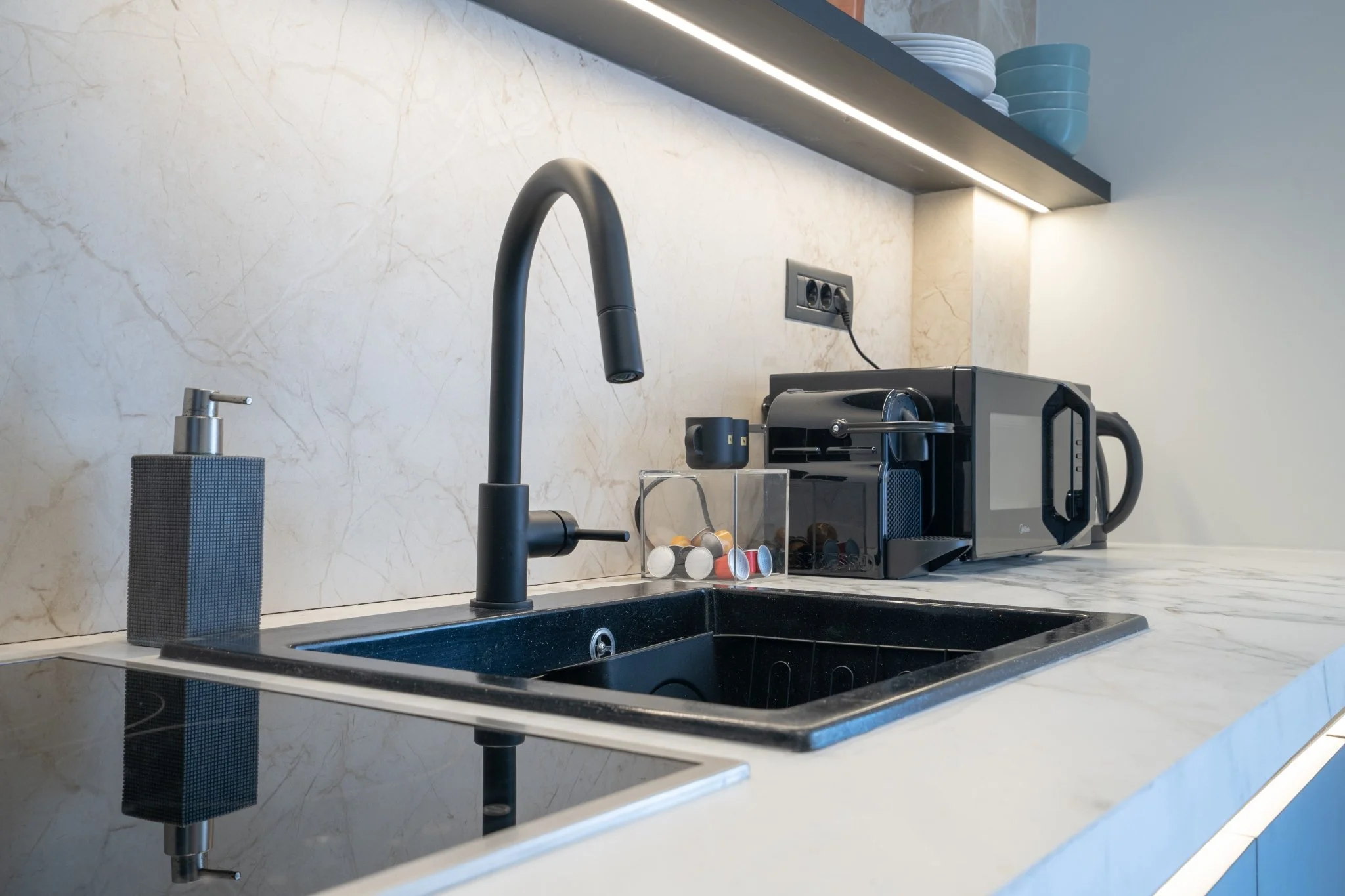 The living area features a spacious, plush sofa and a stunning handcrafted olive tree sculpture which is an exclusive art installation created by a renowned artist that serves as the suite’s captivating centerpiece. The open-plan layout flows effortlessly into a sleek, fully equipped kitchen with all modern appliances, allowing you to prepare your meals with ease and style. The bedroom provides a serene retreat, furnished with a luxurious queen-size bed, premium linens, and soft lighting, while the modern bathroom includes a walk-in shower and high-end amenities for a spa-like experience.