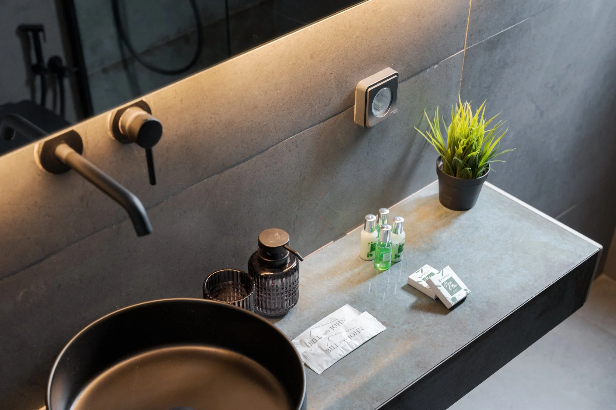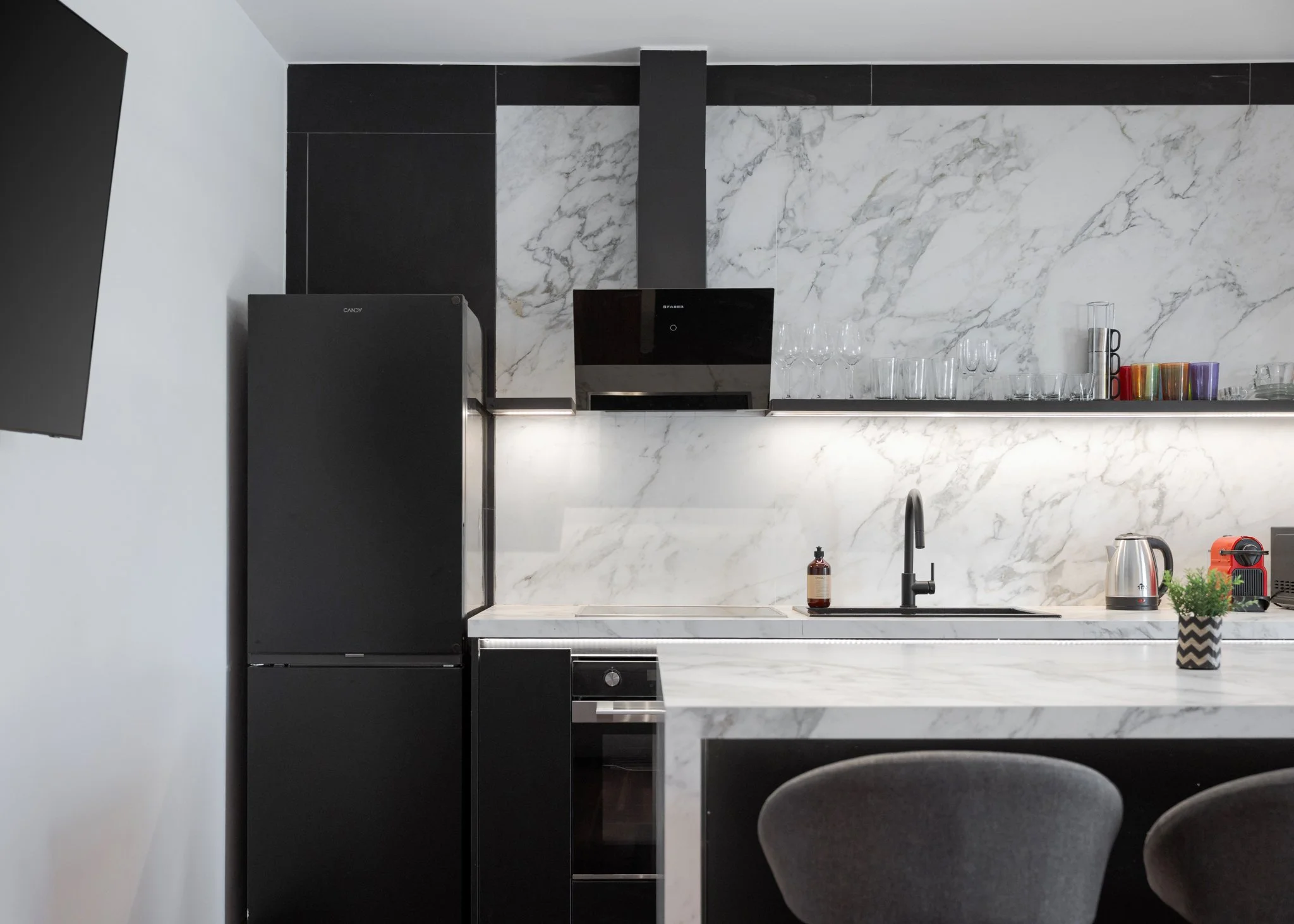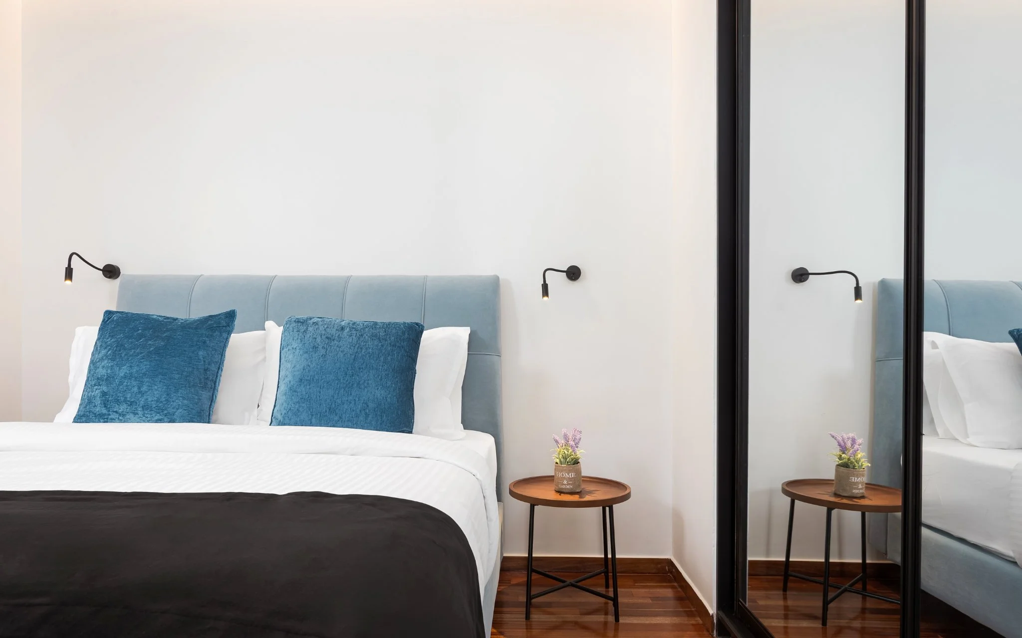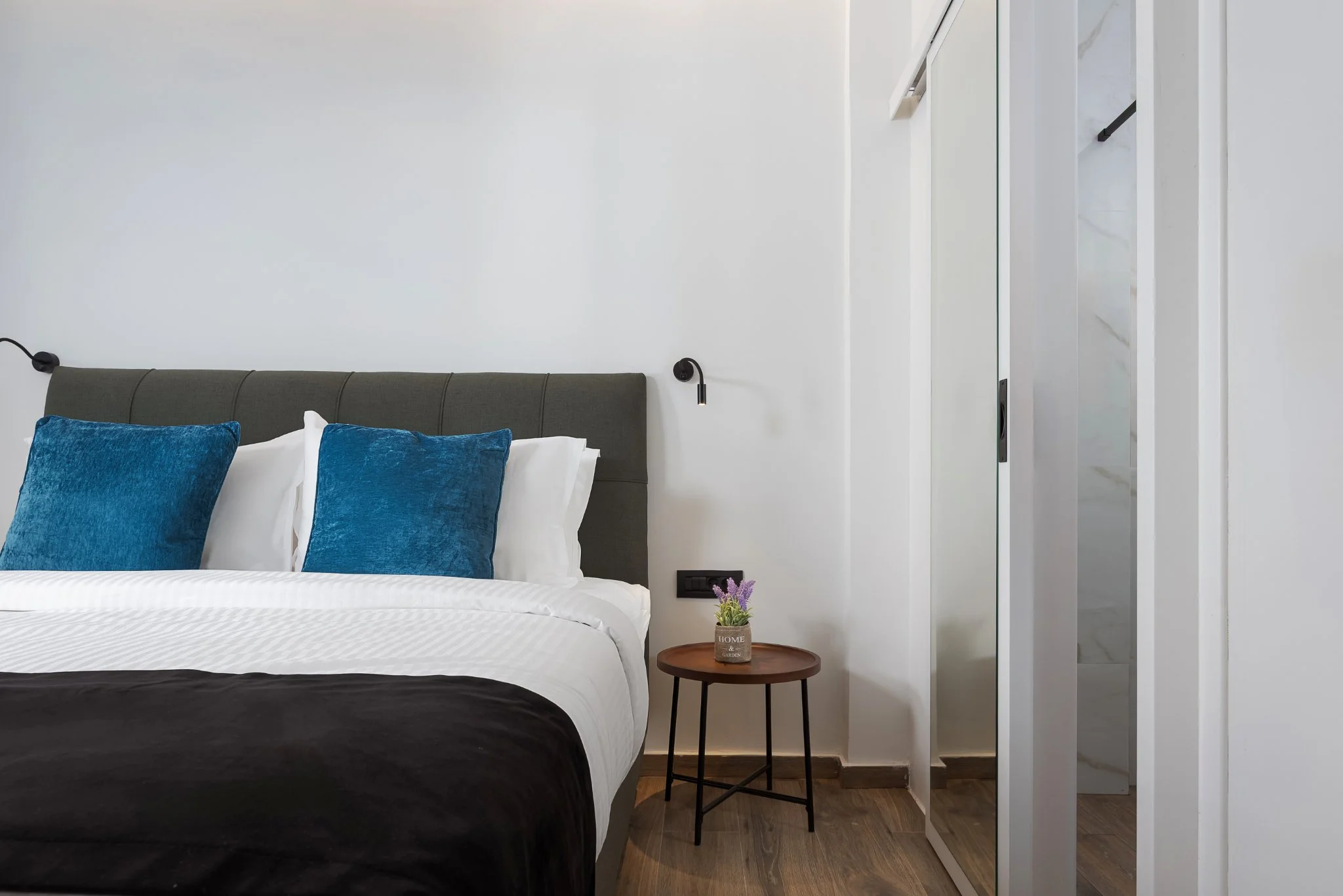 A highlight of the home is the handcrafted olive tree sculpture, a bespoke creation by a renowned contemporary artist that brings a serene, organic charm to the living space. The open-plan living area features a stylish sofa, soft lighting, and a fully equipped kitchen with dining space, perfect for relaxed meals at home. Both bedrooms provide queen-size beds, premium linens, and ample storage, while the two elegant bathrooms feature walk-in showers and high-end finishes.